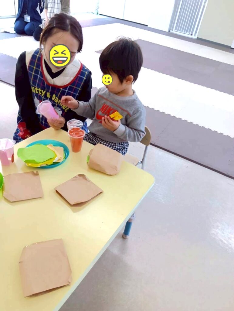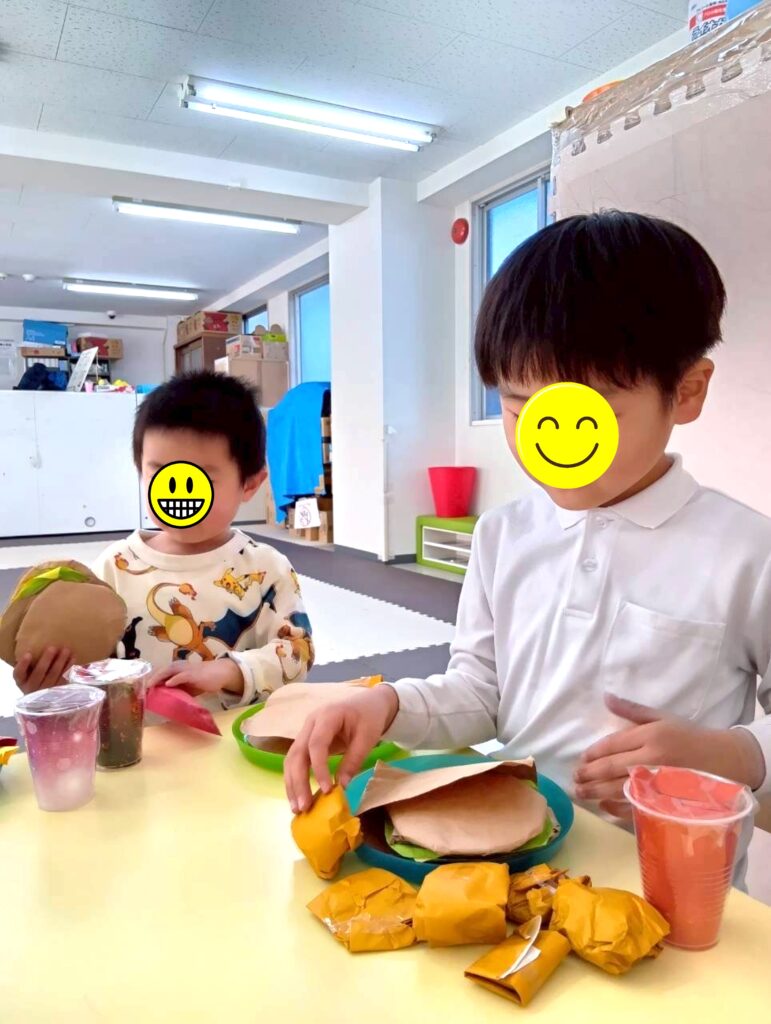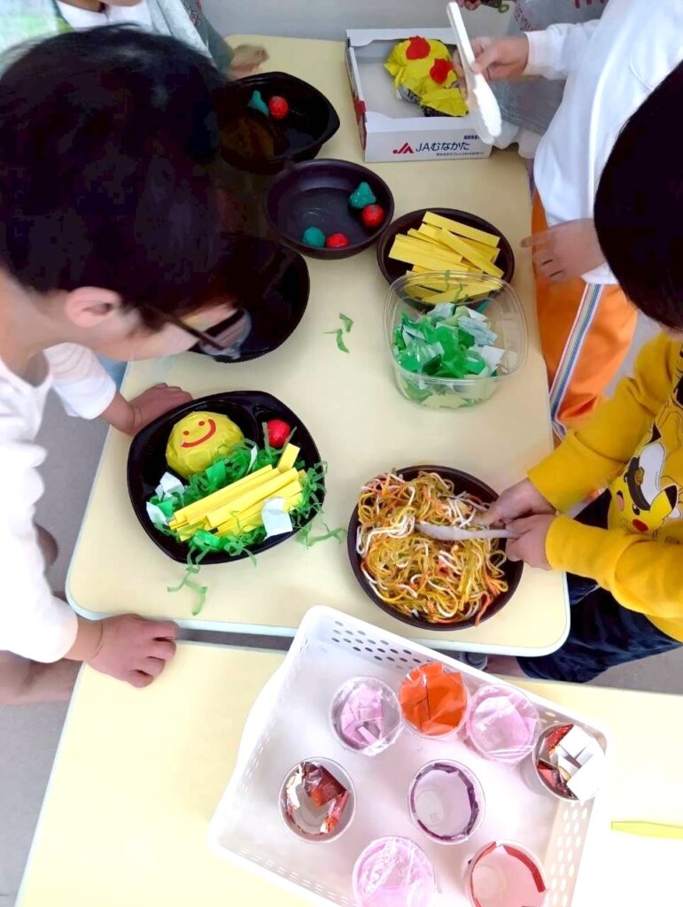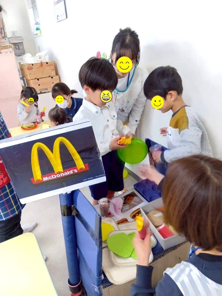 お友だちや先生たちと一緒に、店員さんとお客さんを体験中