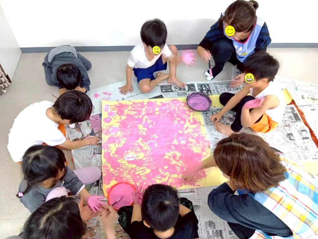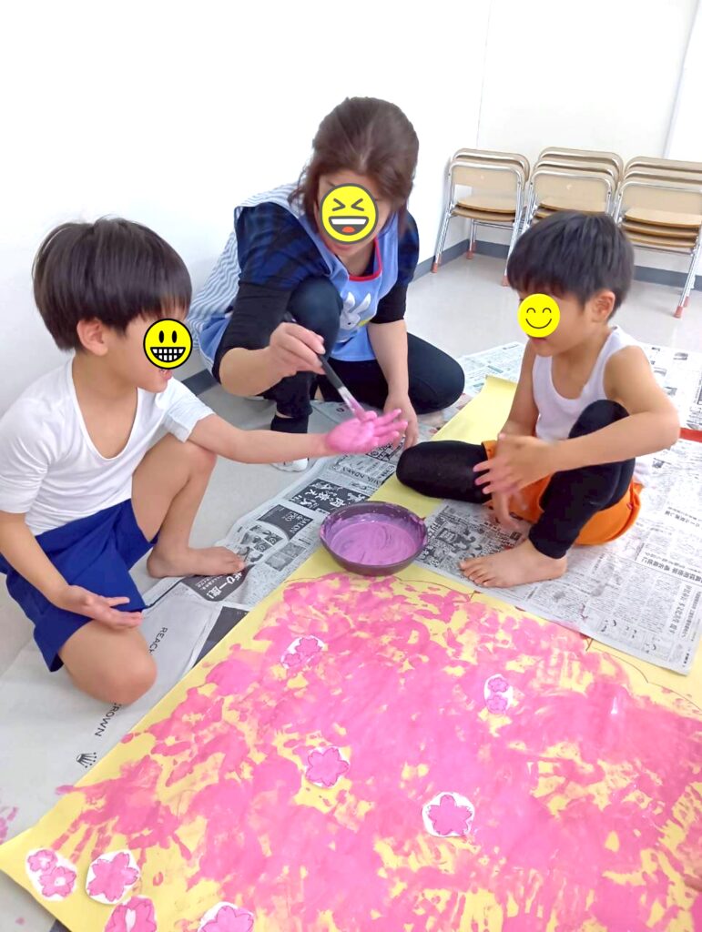 みんなの手を使って、桜の花びらを作っているみたいですね