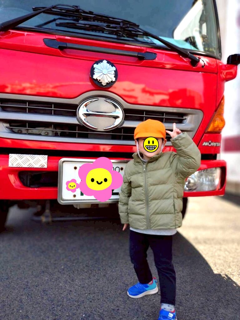 真っ赤で大きな消防車と一緒に